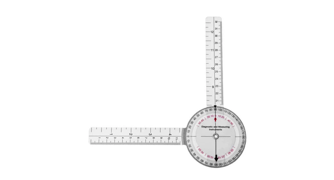 The Baseline 8″ HiRes 360 degree ISOM Goniometer (12-1001HR) is a plastic goniometer featuring a clean, white background behind the gradations, with numbers and text in high contrast for easy readability and top-notch resolution.