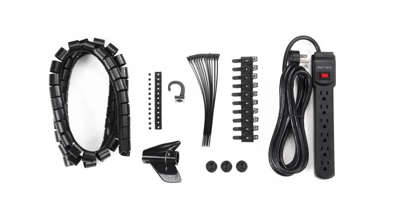 This kit comes with it all: a dozen screw-in cable mounts, a dozen reusable cable ties, ten adhesive readjustable cable tie mounts, three cable management clips, a surge protecting power strip, a cable organizer with wire funnel, and an accessory hook.