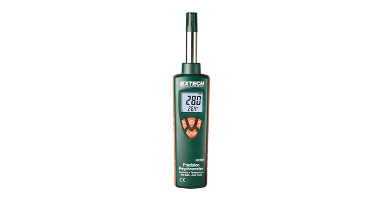 The Extech Precision Psychrometer RH390 has a high 2% RH accuracy, a fast response time, less than 30 seconds, and a dual backlit display.
