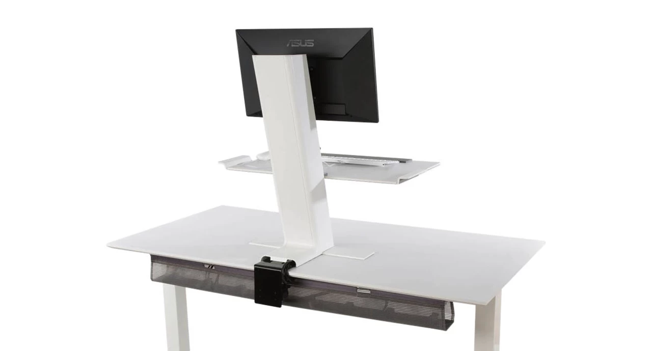 Take your workstation to the next level with the QuickStand Height Adjustable Workstation with Single Monitor by Humanscale. Fixed height desks are on the way out and sit-stand desks are quickly taking their place. Now you have an adjustable desk without having to splurge on a whole new setup. Just clamp mount to your current workstation, install your monitor and stow your keyboard and mouse combo on their own plane. This all-inclusive platform is sleek, can help you manage desk space, and increases productivity throughout the day. Ergonomic living, meet simplicity.