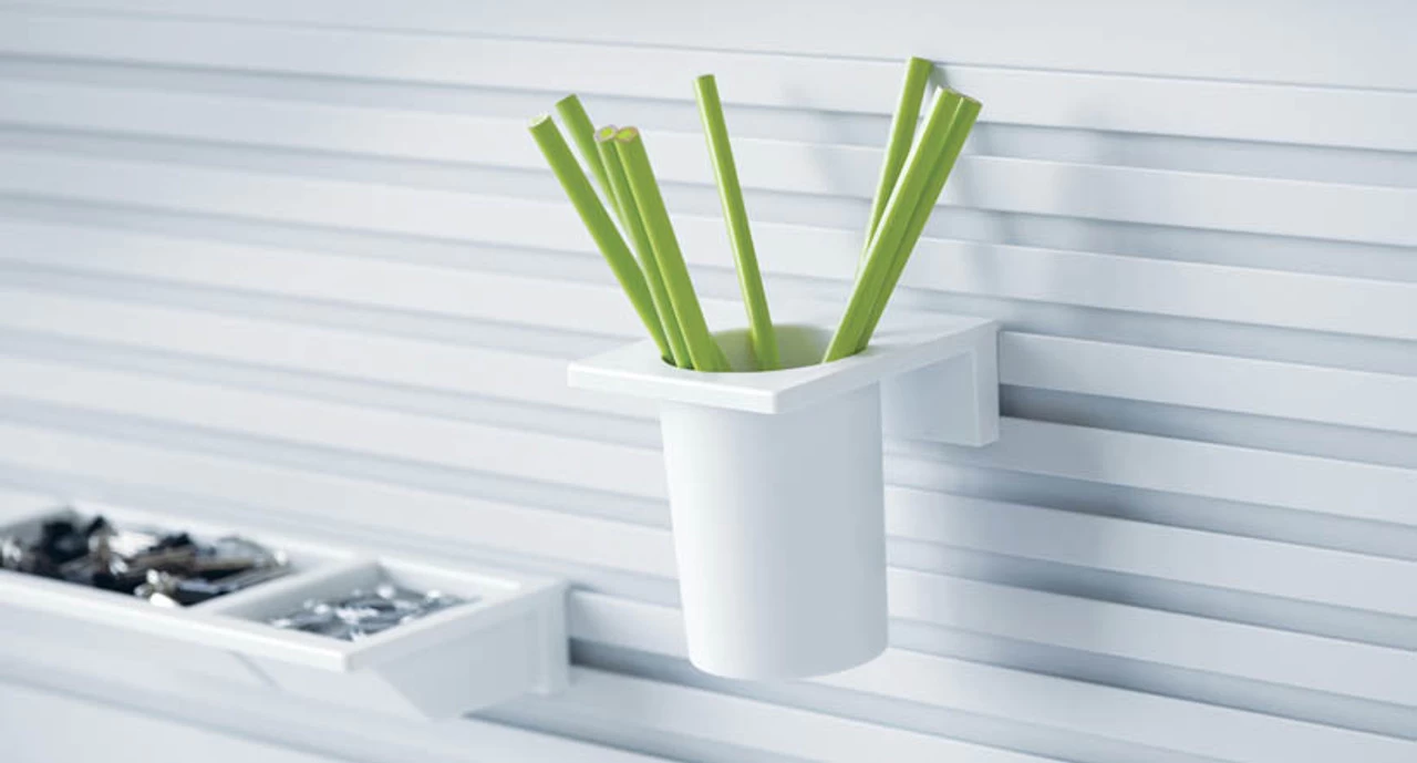 Easily mount this hanging storehouse to your Steelcase Worktools 48″ Slatwall Panel or your Steelcase Worktools SlatRail. The Pen and Pencil Cups are 2 1/4″ in diameter, giving you the perfectly-sized spot for smaller desktop items.