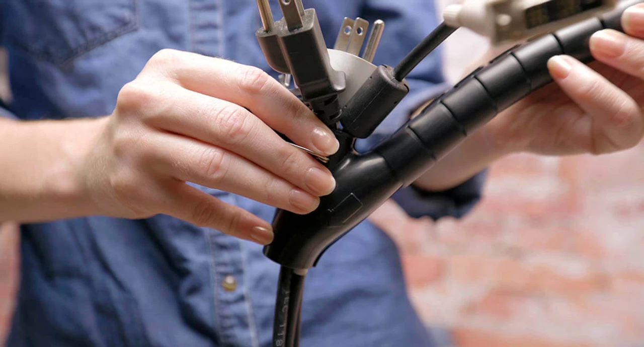 - Cable organizer houses wires in a neat, 5′ long bundle